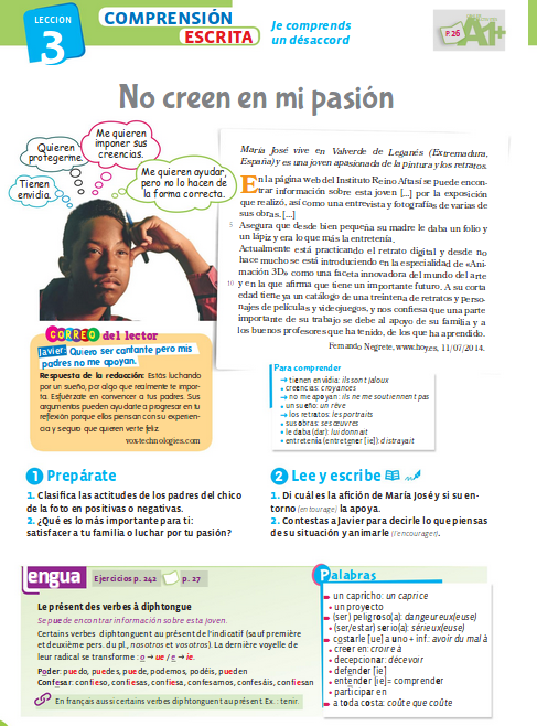 Bonjour, cette semaine votre défi sera de m'expliquer quelle est votre passion et ce que vos parents en pensent. C'est la suite de la page de compréhension : "no creen en mi pasión".